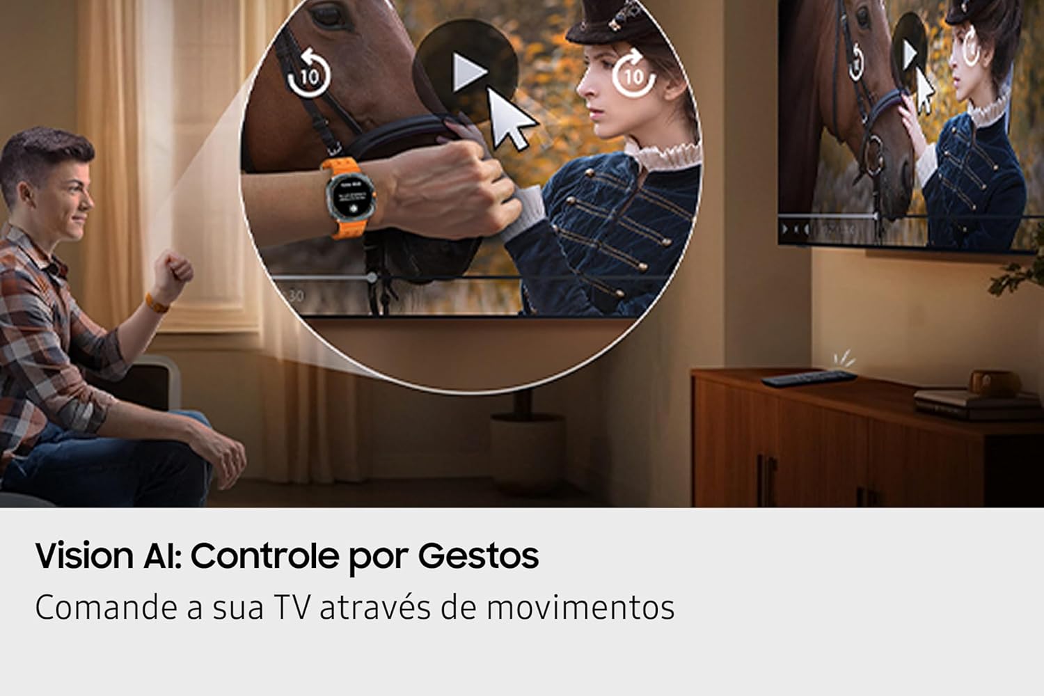 Vision AI: Controle por Gestos: Comande a sua TV através de movimentos. Controle sua TV por meio de gestos usando um relógio Galaxy Watch. Mova o cursor, selecione aplicativos e realize outras ações ou também dê comandos pelo celular, por meio do aplicativo SmartThings.