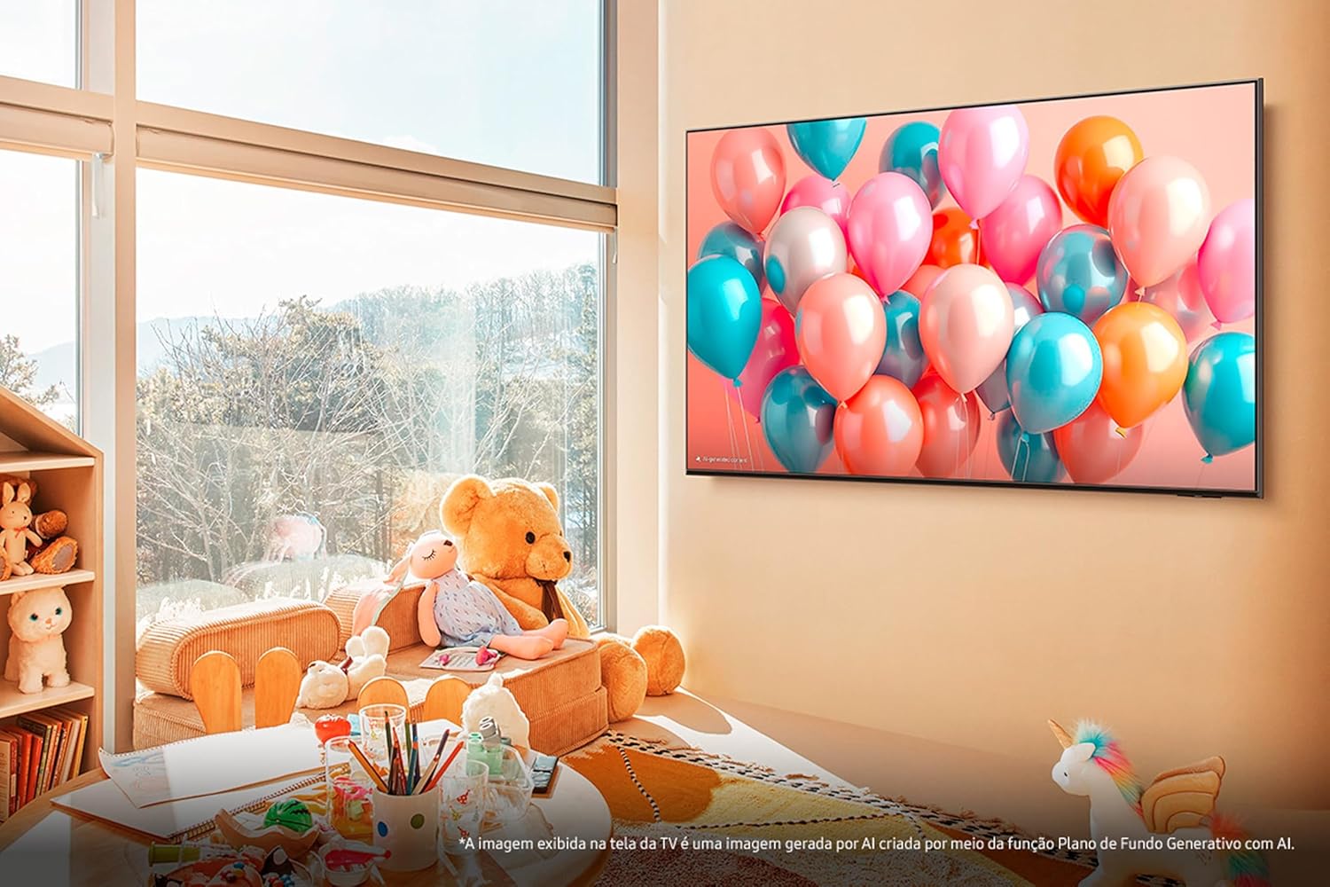 Vision AI: Papel de parede gerado por AI: A Inteligência Artificial cria um papel de parede personalizado para a TV. Aproveite a AI para gerar imagens estáticas baseadas em seu humor e interesses, para deixar a sua TV integrada ao seu ambiente.